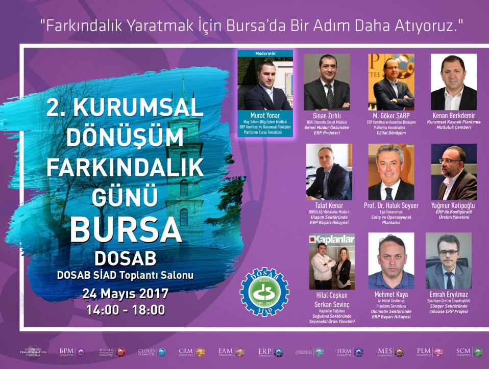 ERP, MES, CRM, İş Zekası ve Karar Destek Sistemlerinin sunduğu stratejik önem, ve proje örnekleri konusunda Bursa'daki firmalarda farkındalığını artırmak amacıyla 24 Mayıs günü Kurumsal Dönüşüm Farkındalık Günü gerçekleştirilerek mevcutta ERP, MES, CRM ve İş Zekası uygulamaları kullanan firmalar ile aday firmalar için marka bağımsız bilgilendirme yapılması ve bu konuda var olan çalışmaların daha da geliştirilmesi hedeflenmektedir.